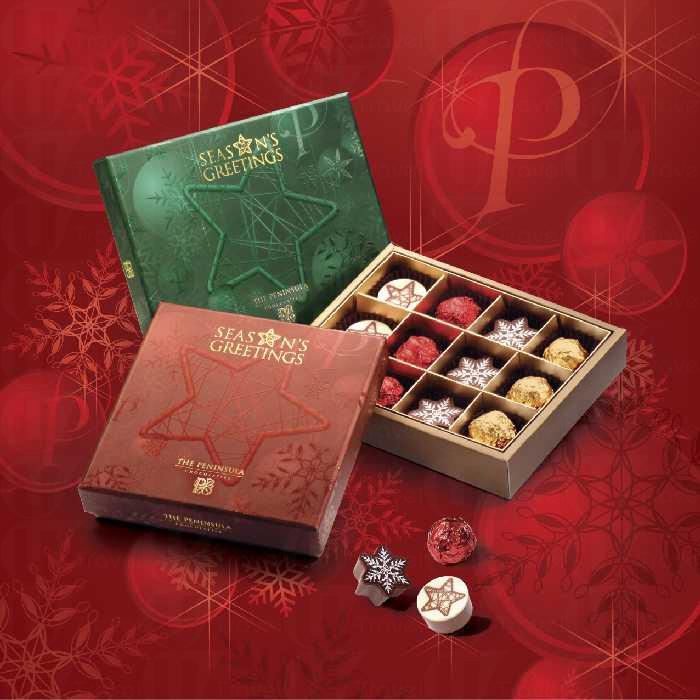 半島精品店設計了多款節日禮物籃,讓大家於佳節送贈摯愛親朋。多款精美禮物及紀念品,包括以半島圖案為主題的水杯、香薰蠟燭禮盒、領帶及鍍銀相架等,以供選擇。半島精品店亦推出一系列朱古力、糕餅、名茶、特製醬料及餅乾,為聖誕帶來新口味。若因禮品太多,令你眼花瞭亂,可選擇餽贈半島禮券。 ● 半島聖誕禮物籃: 6 款精緻聖誕禮物籃售價由 $1,288 至 $4,688,款款均包括多種應節食品及精選禮物。此外,兒童禮物籃滿載節日美食及兒童活動冊子,售價 $698。 ● 半島聖誕朱古力禮盒:朱古力禮盒盛載有 9 粒或 12 粒特製之軟心和榛子蓉朱古力,定價分別為 $260 及 $320。 120 粒精選朱古力禮盒則為$3,888。 ‧節日糕餅:多款精美節日蛋糕 $380 起,須於 3 天前預訂。 ● 半島禮券:半島酒店備有三款不同面額之禮券,以供選擇。 $100 及 $500 禮券適用於香港半島酒店的精品店; $1,000 禮券只適用於半島酒店住房、餐飲服務、半島水療中心療程和 ESPA 禮品,以及於半島精品店選購心愛之禮品;半島水療中心禮券,價值分別為 $1,000及 $2,000 。