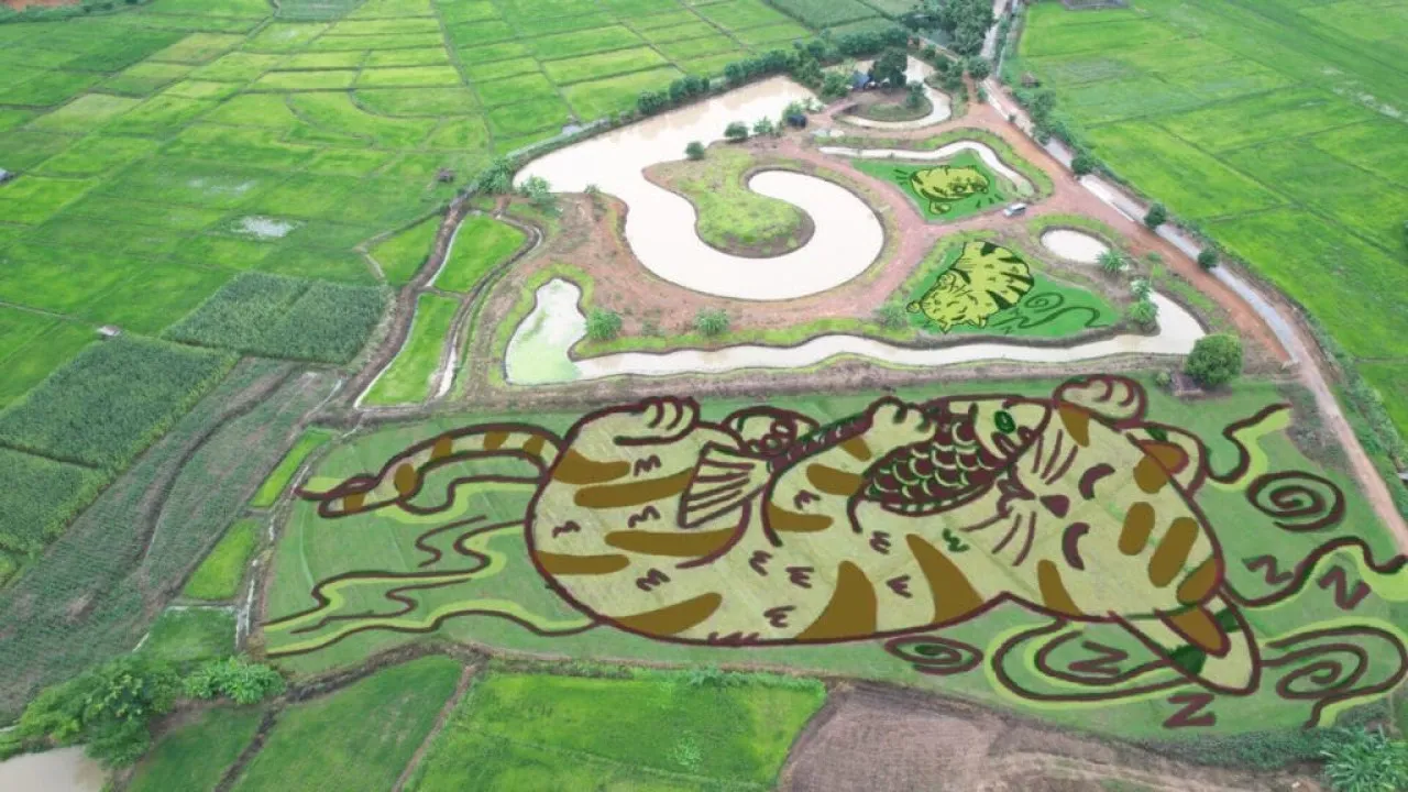 原來呢個係Thailand Biennale Changrai 2023其中一件品,係泰國清萊嘅農民藝術賈克漢(Tanyapong Jaikham),喺200名志工嘅幫助下嘅清萊省田地,利用不同品種、五種唔同顏色嘅稻米,「繪畫」出3幅巨型貓咪畫。從航拍圖可見,稻田有3幅貓咪圖像,一幅係貓咪抱住一條魚瞓覺樣,一幅是貓咪瞓覺,另一幅則是貓咪睜大著眼睛打呵欠。呢3幅貓畫,除咗因為Tanyapong Jaikham喜歡創作,目的其實係吸引遊客及愛貓人士,並順道協助當地發展旅遊業及農業,稻田附近興建咗瞭望塔,以方便遊人欣賞畫作。
