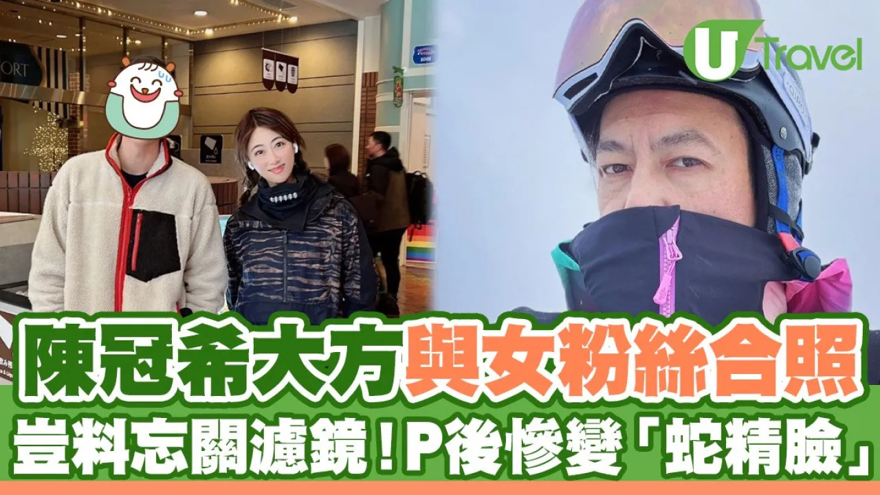 陳冠希不時大方與粉絲合照,外表總是帥帥的。而最近,一名內地女網民在北海道滑雪,巧遇陳冠希隨即要求合照,結果一時手快快,結果用了濾鏡相機拍照,把陳冠希變成下以下樣子!
