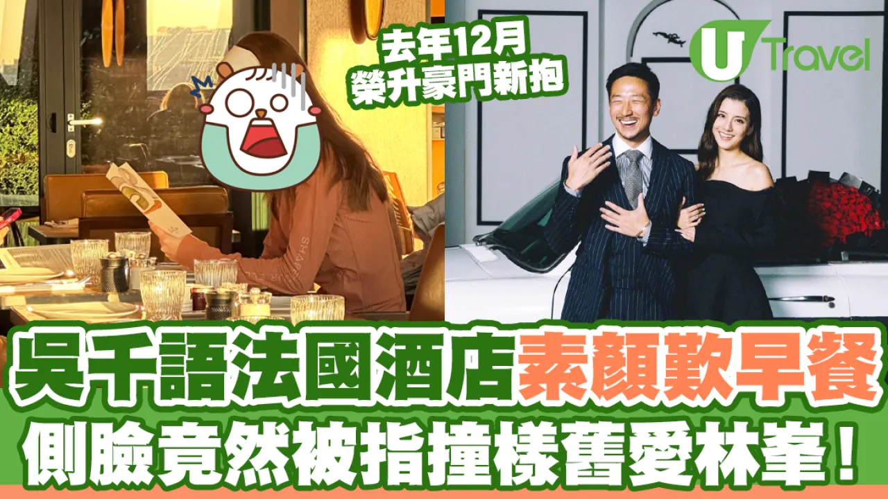 30歲吳千語與「百億富三代」施伯雄(Brian)在去年12月低調註冊結婚,榮升為幸福人妻,在出席澳門活動時澄清沒有懷孕。近日有網民在法國偶遇吳千語在酒店歎早餐,竟然被指素顏側臉似舊愛林峯?