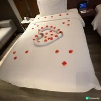 房間空間感十足,門口旁放有開放式衣櫃,亦設有Queen size雙人床,床後牆上更印有維港藝術畫,旁邊亦有一張圓形工作檯,大窗戶配備電動窗簾,望看園林城市景頗開揚。