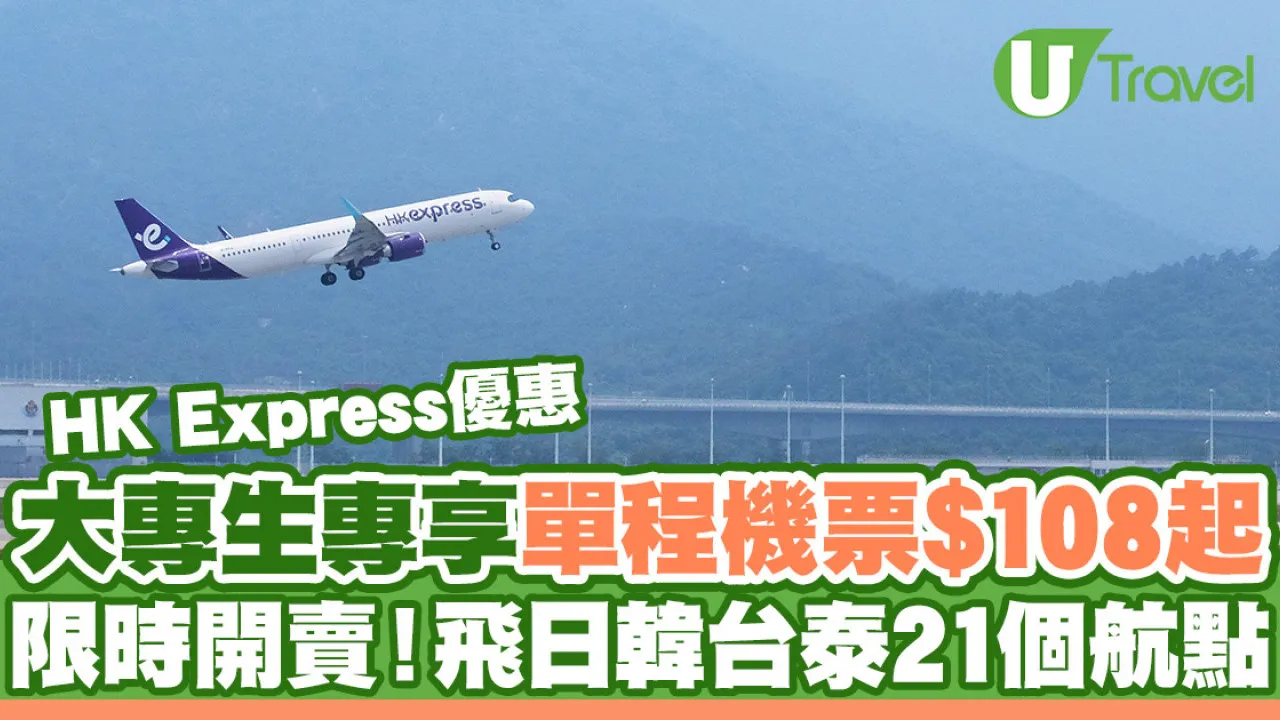 HK Express (香港快運)將於3月25日推出大專院校學生快閃機票優惠,二人或以上訂購機票,其中一位旅客符合大專院校學生條件即可享受優惠,香港飛日本、韓國、台灣、泰國等21個航點單程只需$108起,各位同學仔立即mark實搶飛日期啦!