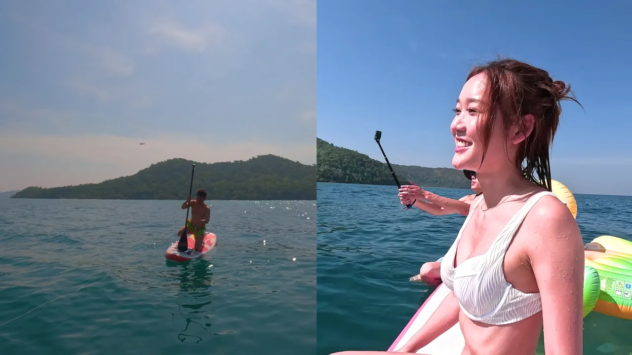 之後他們換上泳衣,準備暢玩水上活動。自稱是「將軍澳美人魚」的Michelle換上一套全白色的三點式泳衣派福利,非常可愛。她率先試玩直立板,雖然表現略驚青,依然成功企直並划出幾步。到行仔出馬,他的運動細胞一般,花了一段時間才勉強企直,可惜很快就失平衡落水。接住他們轉到漁船體驗漁民生活,簡樸而略帶粗糙的布置,別有一番風味。Michelle跟行仔要學習過漁民生活釣魚、下廚全部一腳踢,卻別有一番風味。