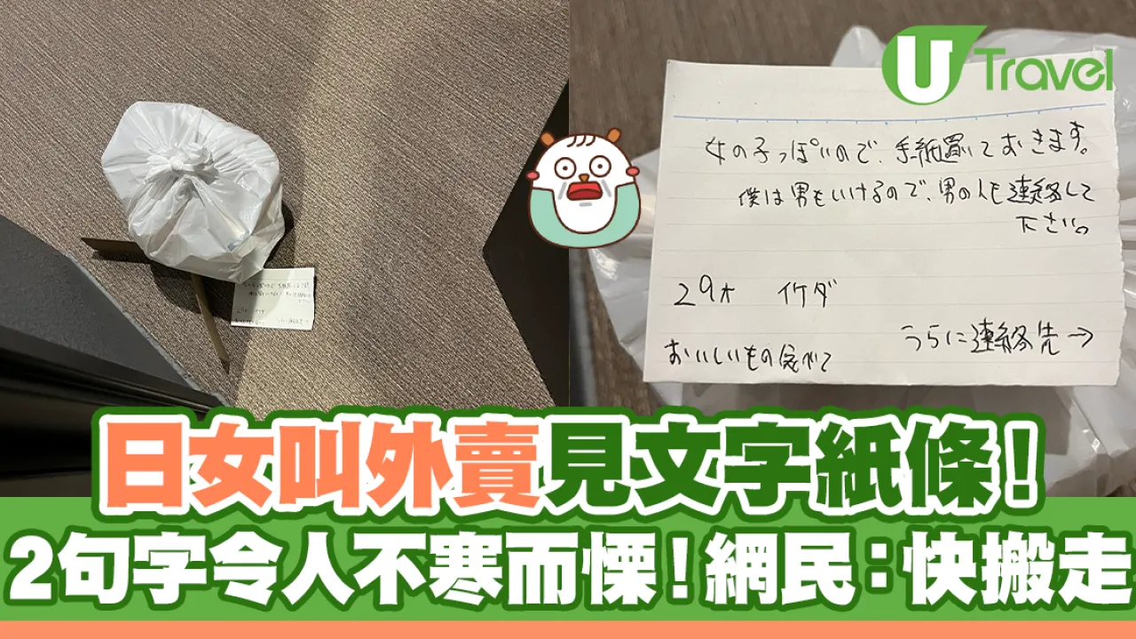 隨著外賣文化的普及,其方便及優惠令不少都市人養成了叫外賣的習慣。近日有一名日本女網友分享,Uber外賣員給她留下的字條,其內容令人毛骨悚然!