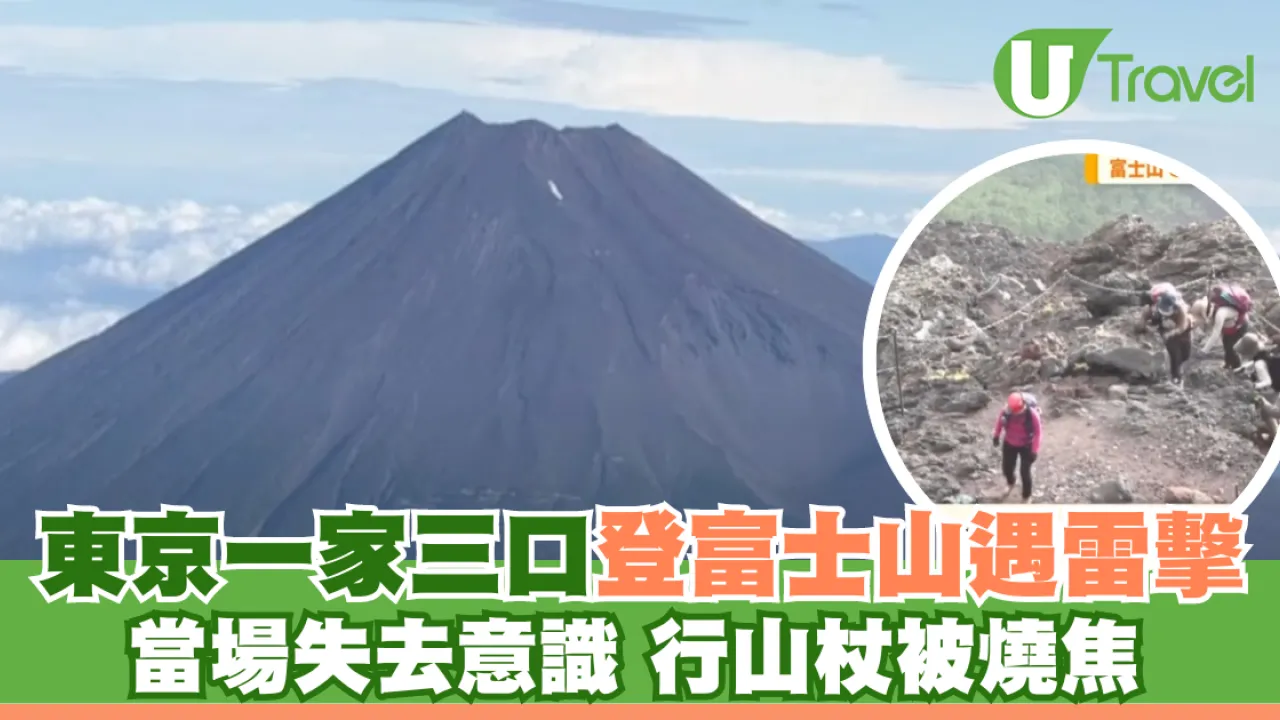 綜合日媒報導,在5日下午1點左右,當時正下著細雨及打雷,一家三口登山客在九合目準備下山時,一道閃電擊中步道,三人失去意識。不久後三人醒來,發現登山杖已被燒焦,且三人的頭、臉受傷,四肢亦麻痹。及後三人自行走到八合目的小木屋求救,再被車子送到五合目。三人向警方表示,他們不記得發生什麼事,回過神來發現自己已倒在地上。