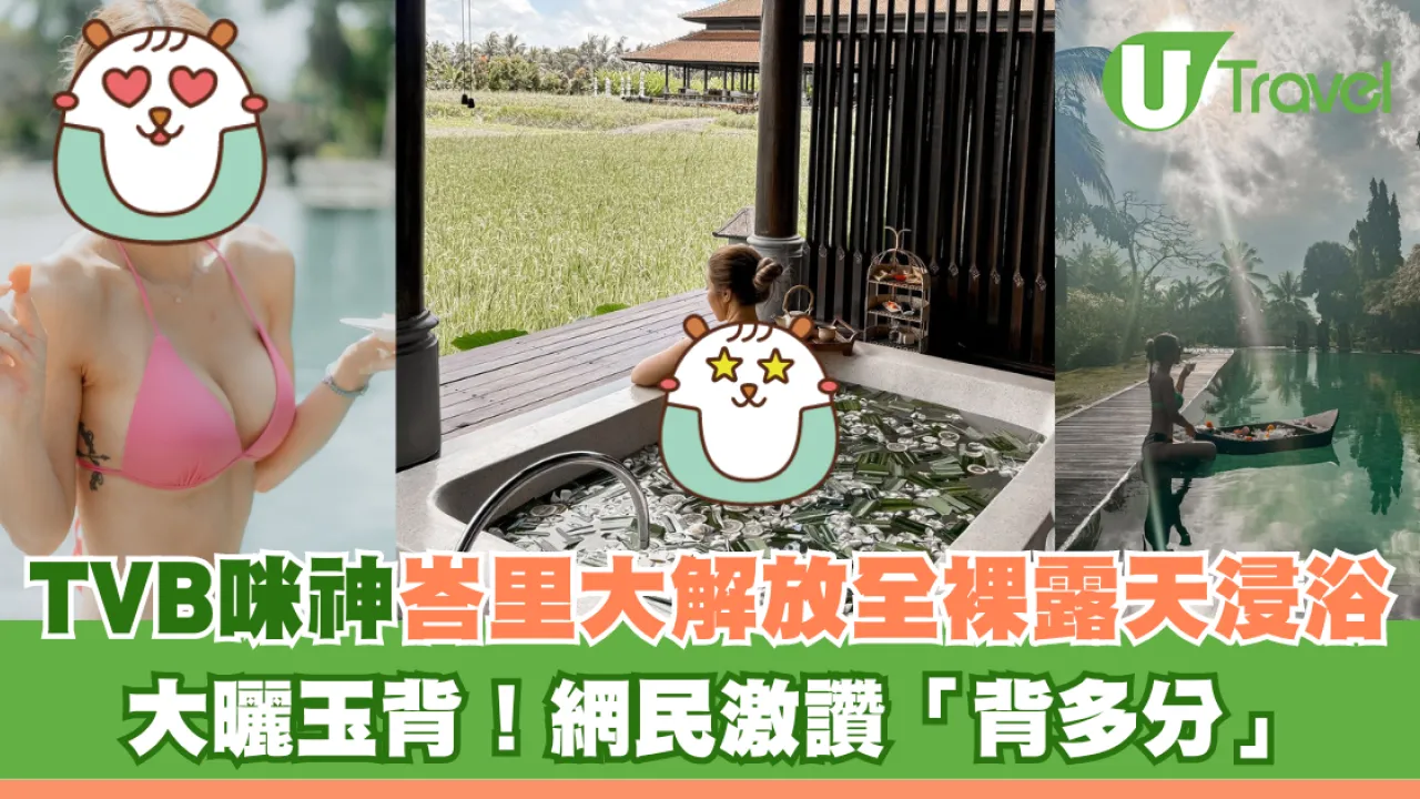 陳婉衡今次po出多套戰衣,除了湖藍色比堅尼外,更有小背心及低胸短裙,大曬纖腰及腹肌,非常誘人!而當中更有一張浸浴照,相中她半裸在露天浸浴,大曬玉背,身材fit爆!有網友大讚:「靚到暈左+背多分!」。