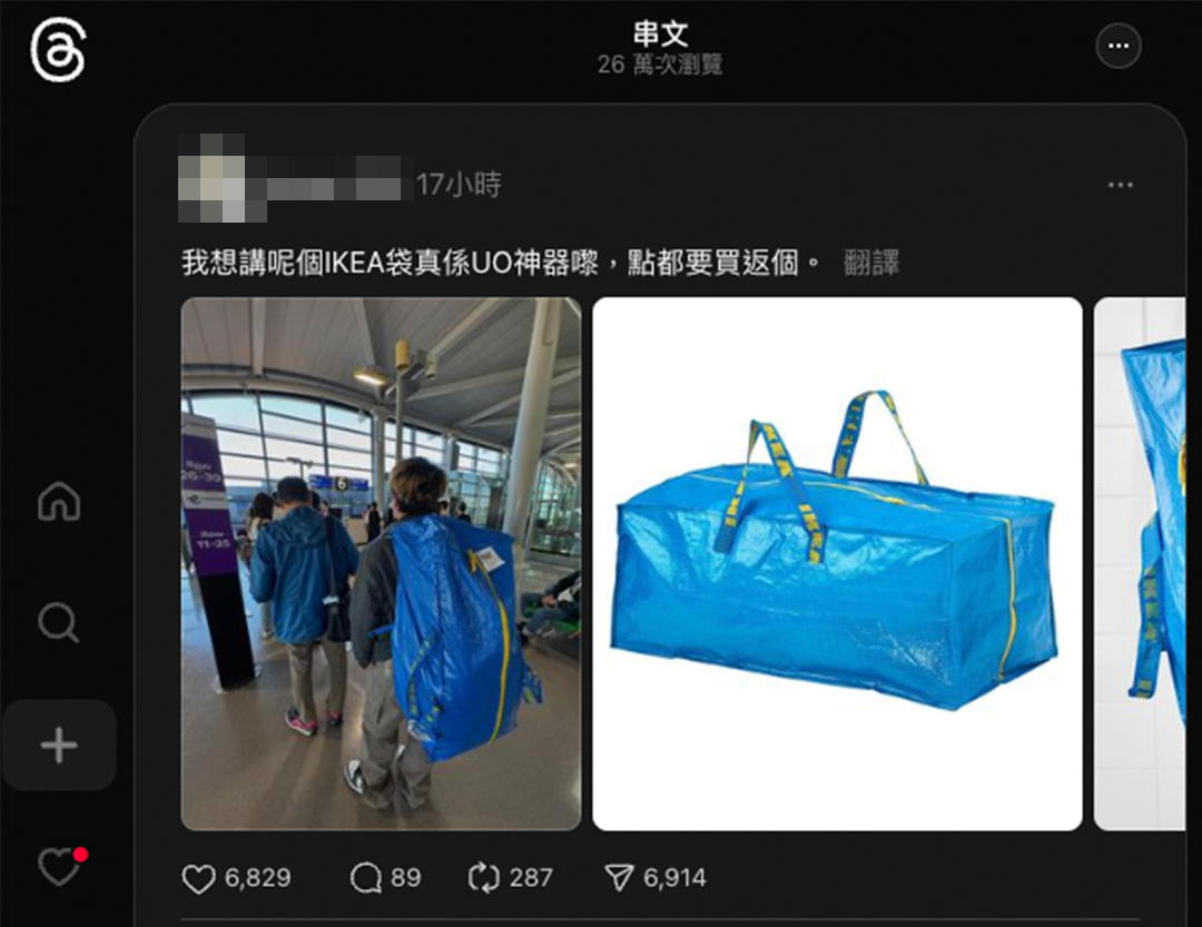 日前有港人在Threads上載了幾張照片,並配文寫道「我想講呢個IKEA袋真係UO神器嚟,點都要買返個」。從照片見到,第一張照片拍攝背景是機場登機閘口,一名乘客正背著一款IKEA購物袋準備登機,所搭航班正是香港快運HK Express,其他照片則是該款IKEA購物袋的產品圖。