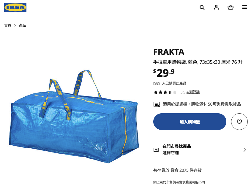 翻查資料,這款IKEA購物袋名為FRAKTA,主要是用作手拉車用,尺寸為73x35x30cm,現時官網售價為$29.9。雖然這款購物袋尺寸超出了香港快運HK Express的手提行李限制,但不少網友表示只要「唔塞爆佢」,預留少許空間「壓縮」,即可符合其登機行李規定。
