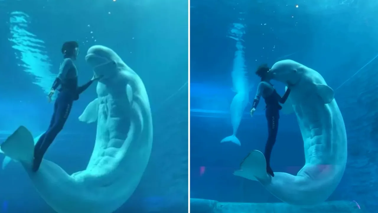 早前,一位遊客於海南省的三亞亞特蘭蒂斯水世界拍攝了一條白鯨的影片,白鯨在飼育員的指導下展現多種姿勢,當牠向前彎曲時,其腹部的肌肉線條清晰可見,彷彿健美選手般的腹肌。