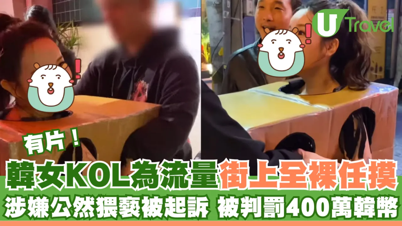 根據韓媒報導,一名現年20多歲的李姓女KOL於去年為了拍片賺取流量,於是脫光衣服,並在身上套上一個印有個人網站Qr code和寫上「Angel Box」的紙皮箱,在路上公然邀請路人伸手任摸。事後她被以「涉嫌公然猥褻」起訴,當地首爾中央地方法院於近日作出判決,她本人被判處400萬韓幣罰款(約21,458港元),另外兩位負責人分別罰款400萬韓幣及500萬韓幣(約26,822港元)。