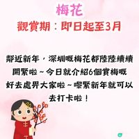 踏入冬天,除了可以在深圳欣賞落羽杉之外,1月底也是梅花的最佳賞花期,可以一次過欣賞到不同風光。深圳有5大熱門賞梅好去處,當中最大的梅園更有近2000棵梅樹,而且有多個品種,不同顏色的梅花互相映襯,十分美麗。