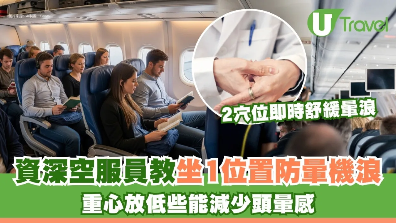 選擇靠近機翼的中央座位,保持重心放低,並按壓內關穴和合谷穴,有助減輕暈機不適。
