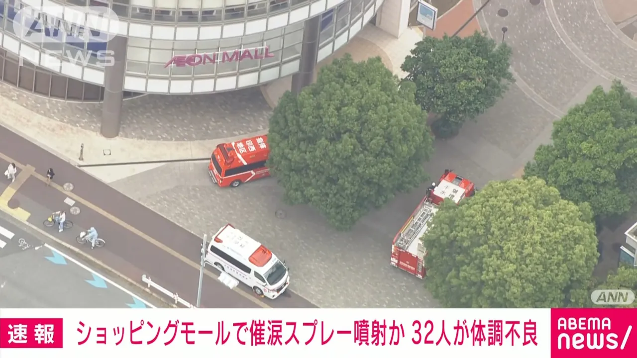 據日媒報導,5月23日下午約3點,日本千葉縣印西市一購物商場停車場發生催淚噴霧事件,警方接報稱現場傳出類似鹽酸的氣味。調查發現,有人使用催淚噴霧,導致32人出現眼睛和喉嚨疼痛等症狀,其中一名69歲男子需送醫治療。事件或因有人吸煙引發糾紛,嫌犯目前在逃,警方正以涉嫌傷害罪展開追捕。