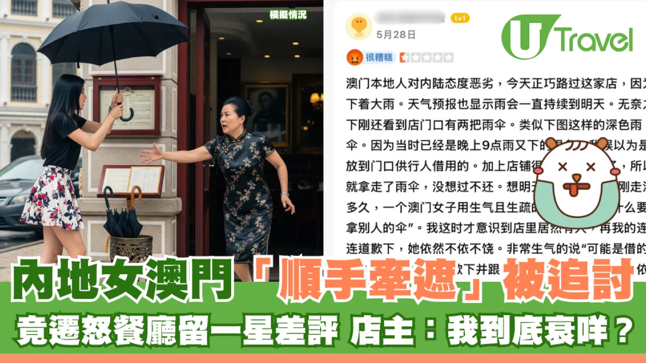 近日,澳門一家餐廳在社交媒體上發文,分享了一宗令人哭笑不得的「偷傘糾紛」。一名路過的內地女在大雨中「順手牽遮」,偷走了餐廳顧客的雨傘,遭物主當場追出怒斥後,竟無故給餐廳留「一星差評」,引發網民一面倒砲轟。