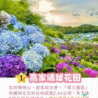 今年陽明山竹子湖繡球花季已於5月23日開始,至6月22日都可以進場欣賞繡球花海。目前竹子湖地區有多個農園,種植共20多種繡球花,色彩繽紛,大家可以在這裡拍出大片的夢幻繡球花海!當中位於陽明山竹子湖下湖區的大梯田花卉生態農園更是賞繡球花的一大人氣景點,皆因這裡以梯田的方式種植繡球花,花季時繡球花開滿山頭,十分壯觀。
