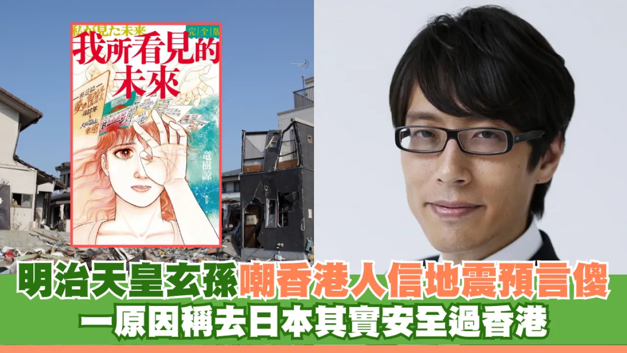 明治天皇的玄孫,身兼作家的竹田恆泰,早前在日本電視節目上表達對地震預言的看法,他不但表示自己不信地震預言,更嘲笑相信預言的港人「太蠢了」,表示其實日本安全過香港,即看內文了解詳情!