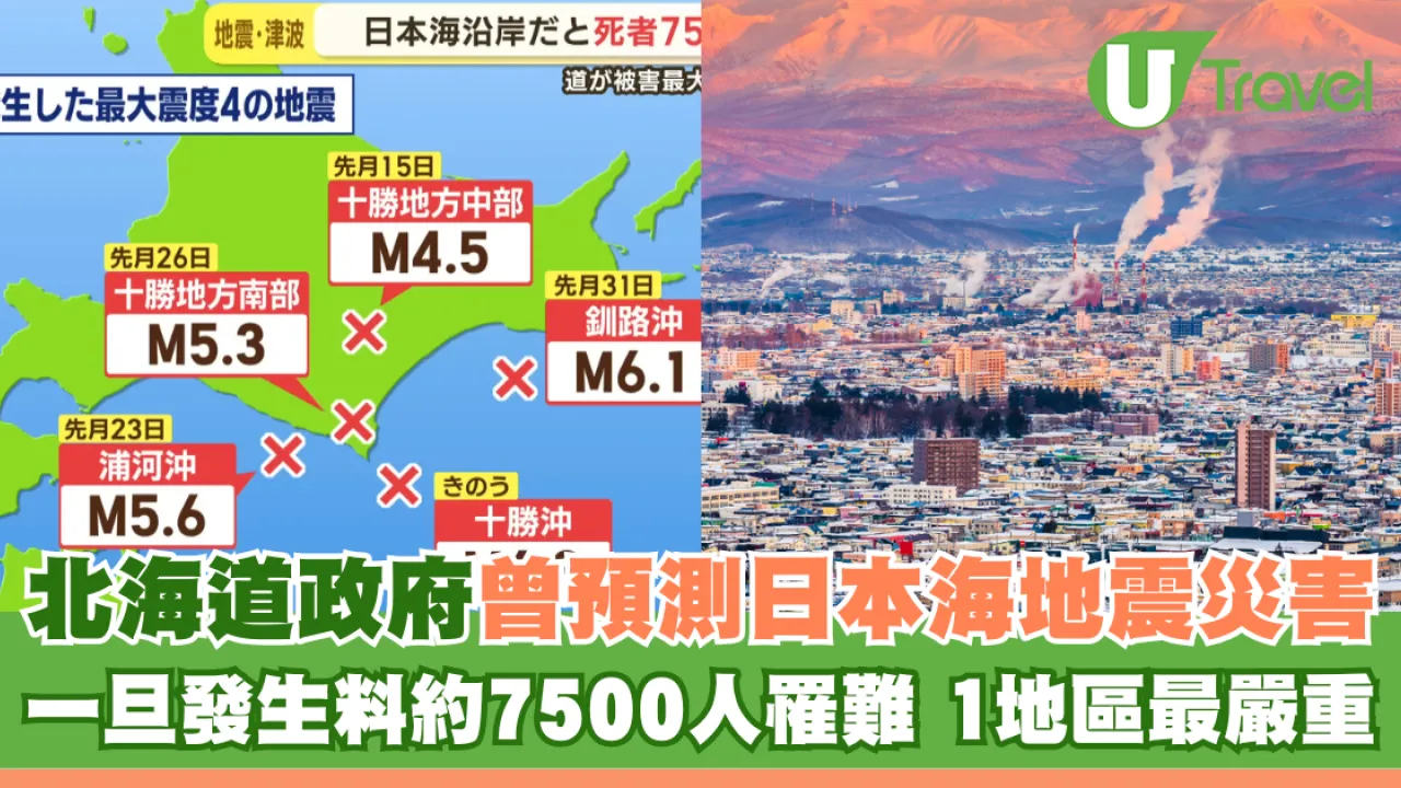 北海道千島海溝附近上個月二十天內發生五次地震,引發民眾對於大地震的擔憂,而日本海一側同樣存在地震風險。根據日本傳媒報導,北海道政府於6月3日公布了假設日本海為震央發生大地震的災害預測,預計最嚴重的情況下死亡人數可能高達約7,500人,全毀建築物約達16,000棟。