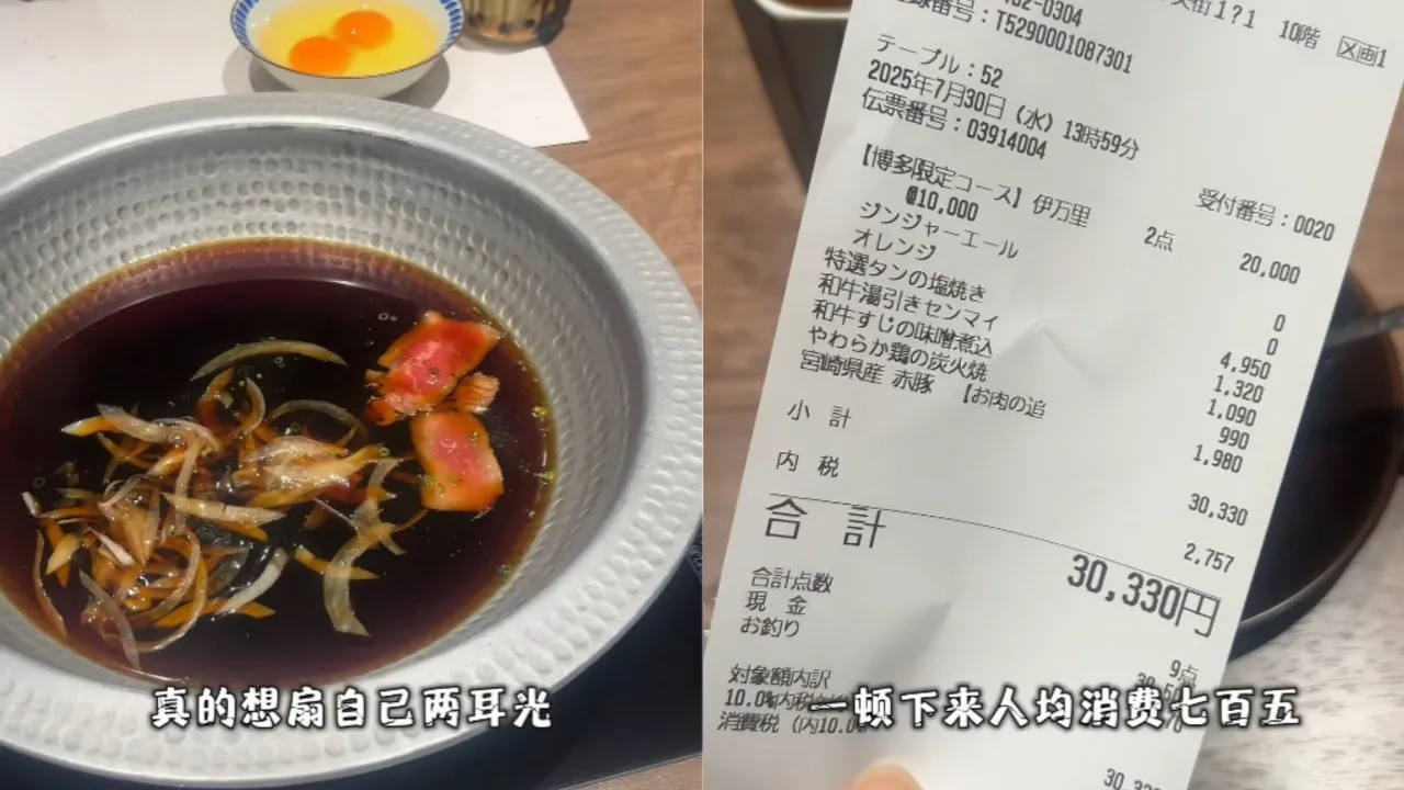 除了食物本身,用餐環境也讓她難以忍受。她表示餐廳的「空調開得特別冷,差點沒被凍死」,可見用餐體驗非常不愉快。最後,旅客貼出結帳帳單,顯示他們一行人當晚的消費總額為30,330日圓,人均消費高達750元人民幣,讓她不禁感嘆「真的想搧自己兩耳光」,後悔不已。