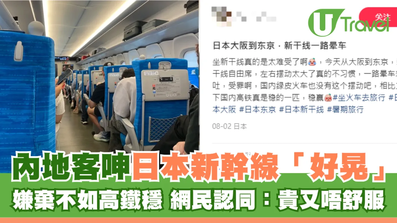 最近一位內地客在社交平台上大呻日本新幹線「晃動太大了」,害他一路暈車想吐,揚言「國內高鐵真是穩的一匹,穩贏」,引發網民對中日鐵路的比較和熱議。