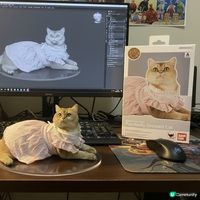 將插畫中的人物塑造為一款七分之一比例的量產級人偶模型,以寫實主義風格呈現,置身於逼真的場景中。該手辦被擺放在一張電腦桌上,其底座採用不帶任何文字的圓形透明亞克力材質。電腦熒幕上顯示著這款模型在ZBrush軟體中的建模過程。在熒幕旁,陳列一個印有原始插畫的萬代(BANDAI)風格玩具包裝盒。