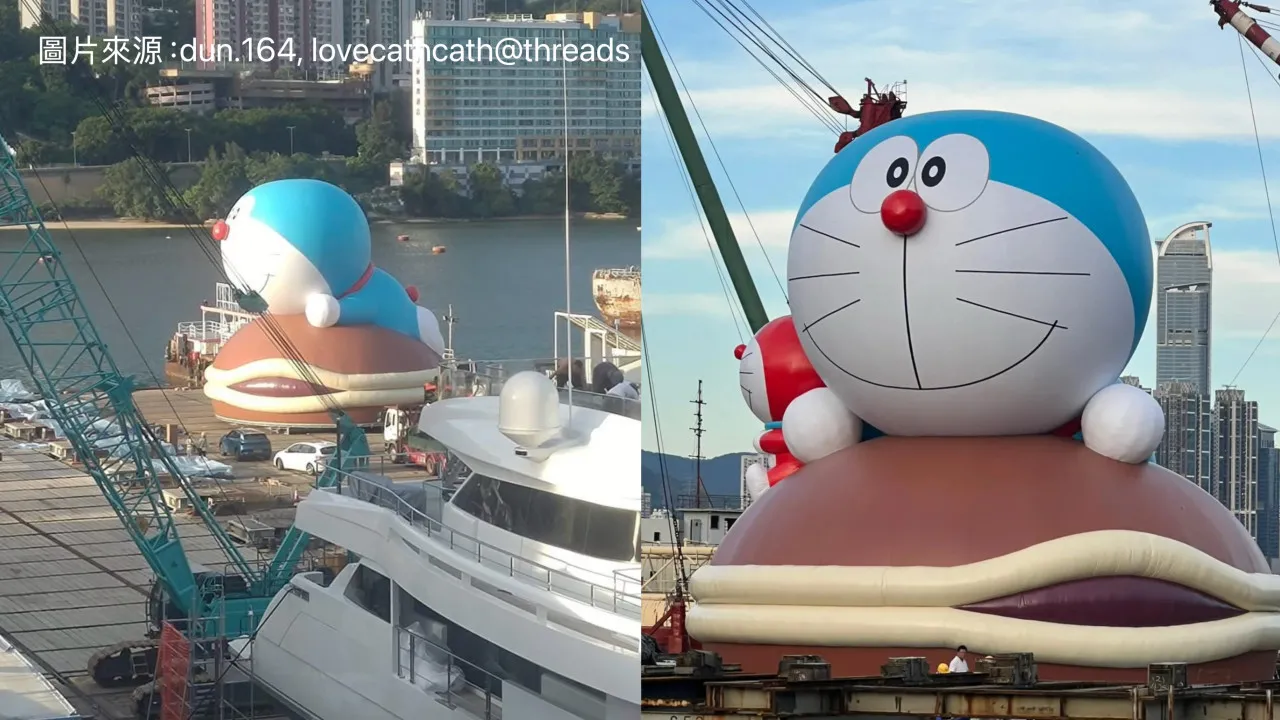 香港青衣島船廠,因一個不尋常的「訪客」引發社交平台熱議——有市民坐巴士經過青衣船廠(汀九橋下)及在家中窗口望出去青衣船廠的位置,看到高達數米的巨型多啦A夢吹氣公仔悄然出沒,多啦A夢還攬着巨型銅鑼燒(豆沙包)蒲頭,非常可愛!有幸看到巨型多啦A夢驚艷現身,網民立即用手機拍低,並上載相片至社交平台分享,當前成了網絡最熱話題,還引發不少人的猜測,這個巨型多啦A夢會拖出維港展覽嗎?