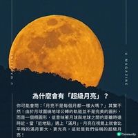 「超級月亮」實際上指的是「近地點滿月」。根據香港太空館的解釋,由於月球圍繞地球公轉的軌道是橢圓形的,因此有時月球會更接近地球,軌道上的最近點被稱為「近地點」。若滿月剛好處於近地點附近,就被稱為「近地點滿月」。這時的月亮視覺直徑會增加14%,亮度比平常高30%,看起來比一般滿月更大更圓,因此被稱為「超級月亮」。