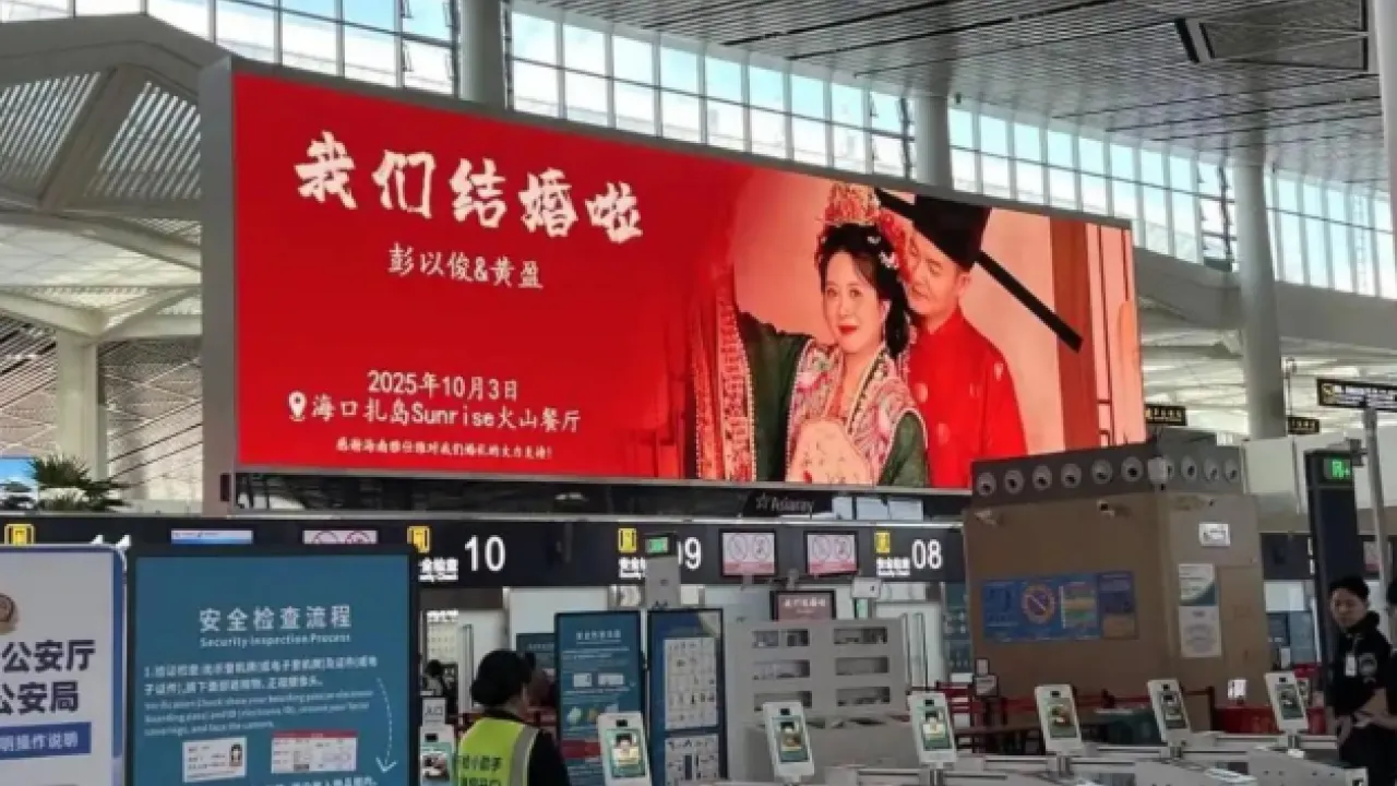 「十一國慶」期間,中國海南海口美蘭機場突然被一則超級「高調」的婚禮邀請函徹底「洗版」!一對新人——海南新娘黃女士和廣東新郎彭先生,竟然豪氣包下了機場的 88 塊螢幕,從登機口到大螢幕,同步播放婚訊,還連續播足了 8 天!這波操作立刻在網上引發熱議,不少網友驚呼:「這是邀請全海南進出港旅客喝喜酒嗎?」