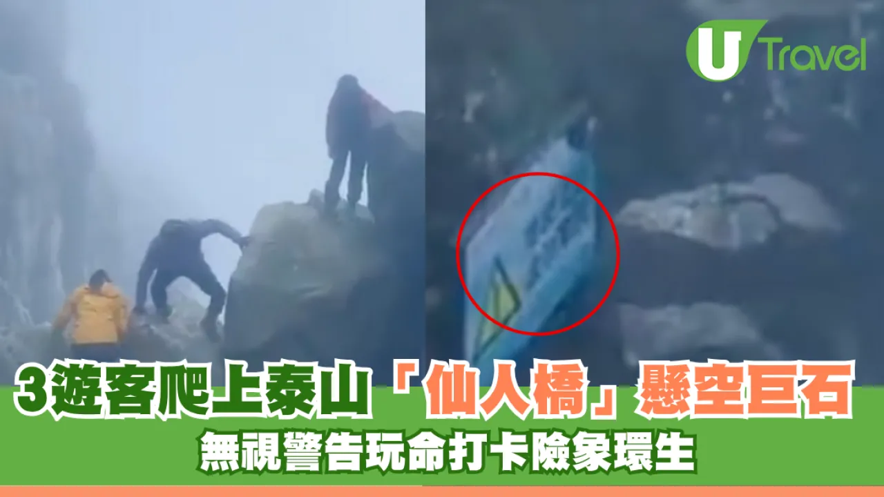 三名遊客無視景區「危險止步」的警告,爬上泰山「仙人橋」的懸空巨石拍照打卡,將生命置於危險之中。