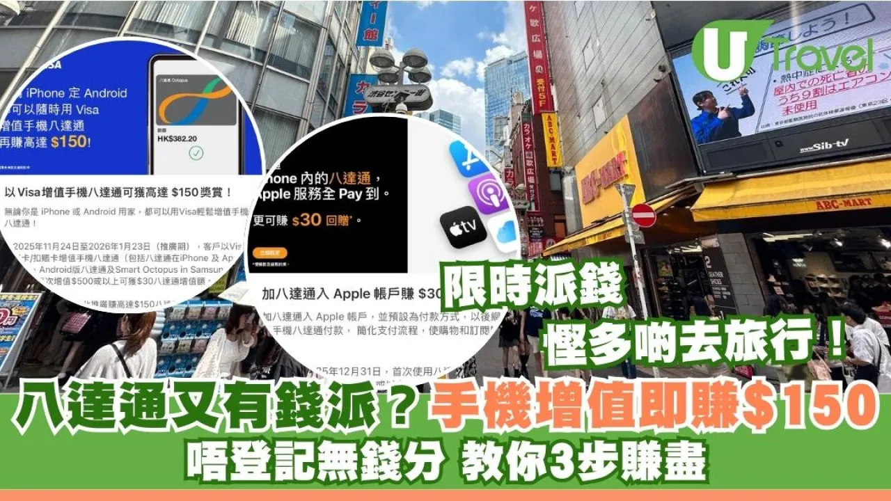 由即日起至2026年1月23日,用戶透過Visa卡為手機八達通增值,單次滿HK$500或以上,可獲HK$30增值額回贈,每人最多可享5次。