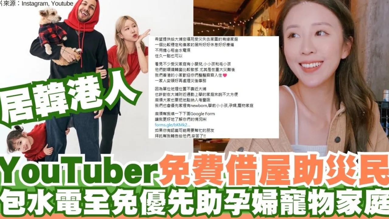 居韓港人YouTuber Lizzy daily免費借出她位於將軍澳的一個小型物業,協助大埔宏福苑火災中失去家園的家庭暫住,並免收租金、水電煤雜費。