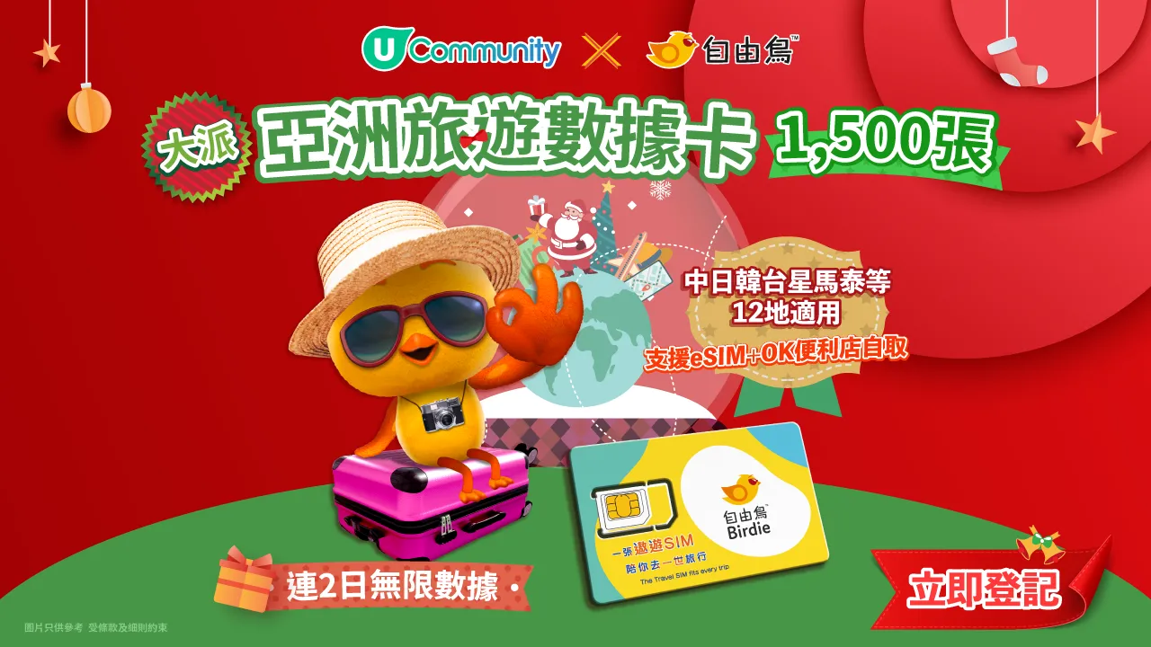U Community社群 X 自由鳥大派1,500張亞洲2日旅遊數據卡🌎!中日韓台星馬泰等地適用,每日享有1GB全速+無限數據,無須實名認證即插即用。同一張SIM卡就可於60個國家通用,去邊都唔使再換卡🤩!即日起至2026年1月5日,只需簡單登記即有機會免費獲得!