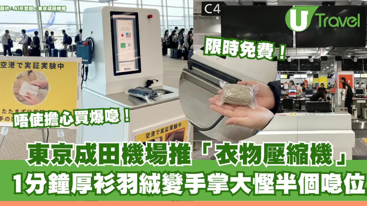 到日本旅遊,許多旅客都會購買大量手信「買爆喼」,回程時或會面對行李箱空間不足的問題。成田國際機場日前宣布與企業SJOY 合作,將於 2026 年 1 月 13 日至 15 日推行為期三日的實測計劃,於機場內引進「衣類專用自動壓縮機」。