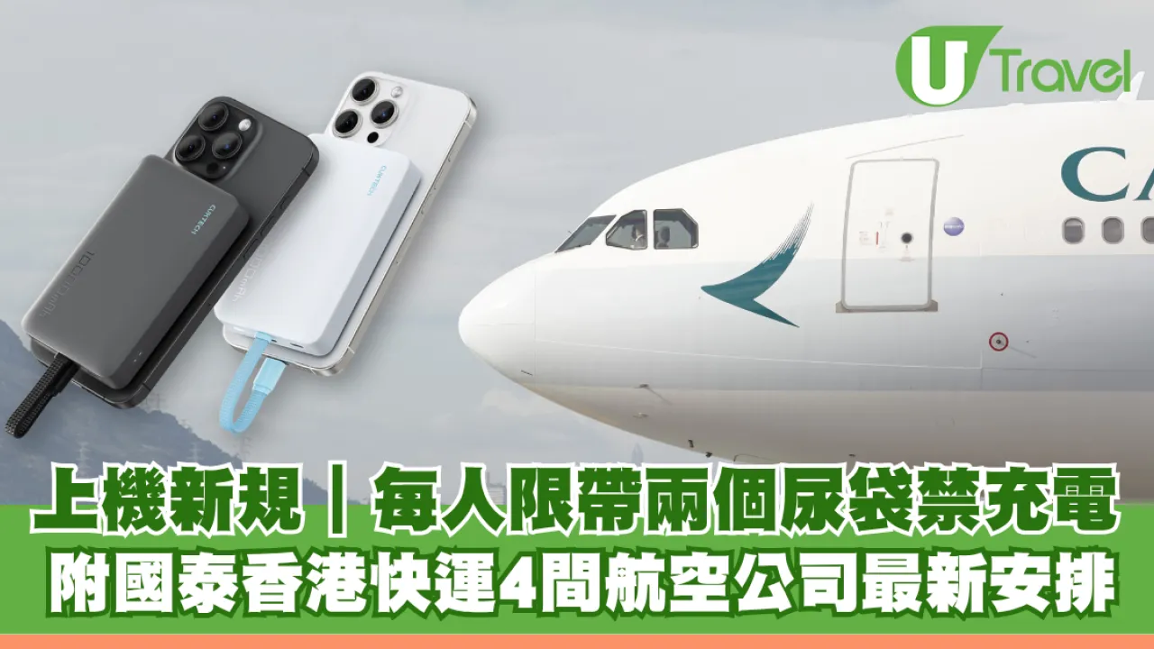 搭飛機帶尿袋新規!國際民航組織(ICAO)頒布全球新例,限制每名飛機乘客最多僅可攜帶兩個流動充電器(尿袋)登機,且全程嚴禁在機上充電。國泰航空、香港快運、香港航空及大灣區航空宣布即日實施新規定。超出數量的充電器將被機場安檢沒收。即看內文了解更多詳情。