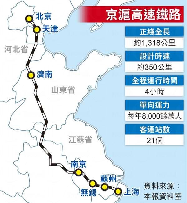 2 月 20 日開始,新一代高速動車組和時速 400 公里高速綜合檢測列車在京滬高鐵上海段(山東棗莊西─南京─上海虹橋)上「飛馳」。據介紹,近日上海鐵路局在徐州部署了京滬高鐵聯調聯試與綜合試驗工作,上海段 5 月中旬至 6 月中旬將進入試運營。 2011 年 11 月 15 日,京滬高鐵全綫鋪通。今年春節前,京滬高鐵電氣化接觸網工程全綫貫通,同時全綫變電和電力工程具備受電啟動條件。為了迎接今天高速動車的「試跑」,昨天凌晨該段正式通電。 據悉,京滬高鐵上海段聯調聯試的時間節點是:2 月 10 日完成靜態驗收,15 日完成專家組評審;2 月 18 日具備列車上綫條件,20 日開始聯調聯試。 5 月 10 日全面完成聯調聯試, 5月中旬至 6 月中旬進入試運營,6 月中下旬正式通車。 京滬高鐵上海段從山東棗莊西至上海虹橋,綫路全長 645 公里,設計時速 350 公里或以上,其中棗莊西至蚌埠先導段聯調聯試已於日前全面完成,試跑速度達到了 486.1 公里,相當於噴氣飛機低速巡航的速度。 京滬高速鐵路貫穿北京、天津、河北、山東、安徽、江蘇、上海 7 省市,全長 1,318 公里。預計 6 月通車後全程約需時 4 小時,目前尚無制定票價。