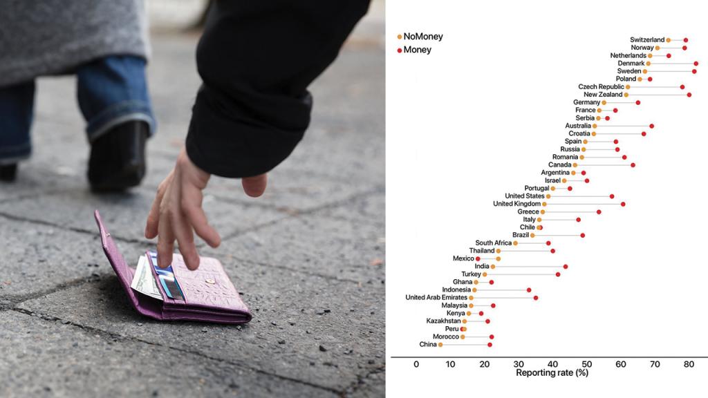 調查員在每國公或私營設施附近稱自己在街上撿到錢包,但由於趕時間的關係只好拜託其他途人歸還失主,看看途人會否在100天內聯絡卡片上印有的電郵地址。調查發現不論錢包有錢與否,瑞士國民的整體歸還率都高於80%,其次是挪威跟荷蘭,平均維持70%左右。而中國、摩洛哥、秘魯的誠實度最低,就算錢包內沒有錢,中國國民願意歸還的百分比少於10%,為當中最低。