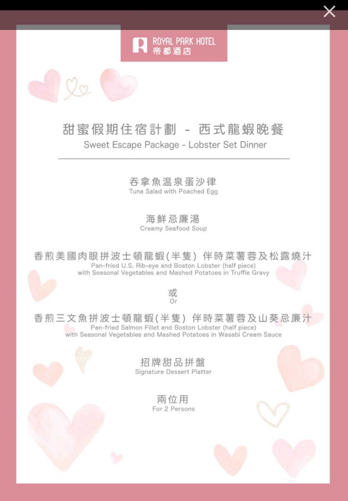 - 於房內享用豐富晚餐2位 (查看菜單)