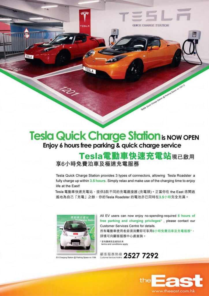 在The East中,Tesla電動車快速充電站現已啟用。Tesla電動車快速充電站,提供3款不同的充電連接器(充電頭)供顧客使用。Tesla Roadster的電池在3.5小時後就完全充滿電。另外,所有電動車使用者可免費享用6小時泊車及充電服務。詳情可向The East顧客服務中心查詢。