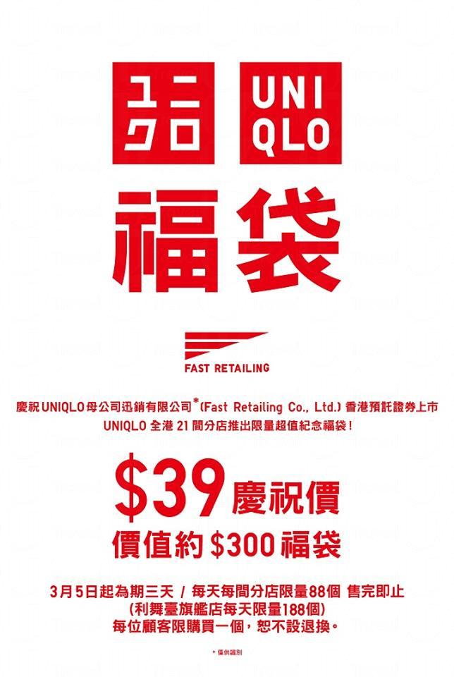 UNIQLO推出$39限量福袋,唔買會唔會走寶!? 為慶祝UNIQLO母公司迅銷有限公司(Fast Retailing Co., Ltd.)香港預託證券(HDRs)即將於香港聯合交易所第二上市,UNIQLO全港分店將於3月5-7日期間,限量以HK$39慶祝價發售價值約$300的福袋。 提提大家,利舞臺旗艦店將每天發售188個,其餘分店每間每日限量88個,售完即止,不設退換。 ----------------------------- [首日現場直擊] 每個福袋有3-4件貨品,總值超過$300,分男裝女裝的中碼及大碼,每個碼數各22個。雖然UNIQLO指早上11點開賣,但部份分店(如利舞臺)已搶閘開賣,建議大家早些少去排隊,現場排隊的朋友指早上8點已開始排隊呢。 小貼士: 除了早點排隊外,小心別拿錯尺碼啊,若不清楚自己的尺碼,最好之前一晚先去看看。 雖然相片有幾款福袋內容,但只作參考。畢竟是福袋,個個都會有分別,筆者問過店長,都話唔知福袋的內容。