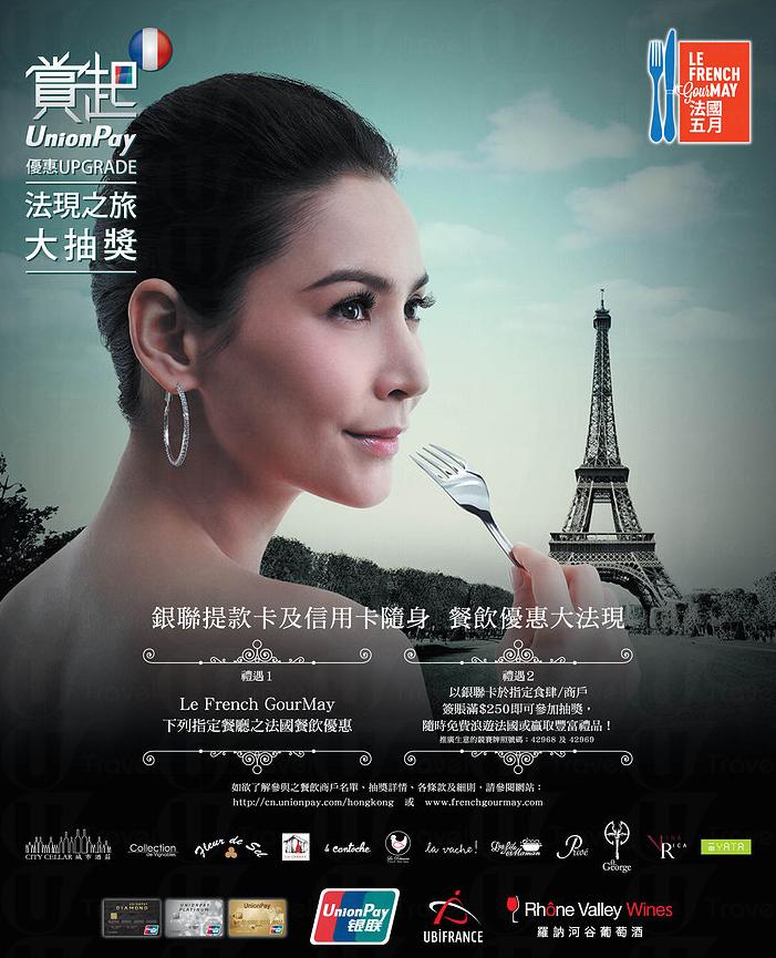 想到法國感受寫意浪漫情懷,品嘗法式美酒佳餚,但奈何無暇抽身? 銀聯國際今年首次與「法國五月美食節」合作,於5月1日至31日期間推出優惠,讓銀聯信用卡或提款卡持卡人留在香港或澳門也可恍如置身法國般,享受餐飲優惠,更可參加大抽獎,贏取與至愛親朋一同暢遊法國的機會。 指定餐廳商戶消費 享折扣 銀聯卡持卡人憑銀聯卡可於13間指定餐廳及商戶消費,如La Cabane Wine Bistro、St.George-Hullett House等。 優惠包括全單折扣、獲贈免費甜品、餐酒以至法式精品等。 另外,持卡人憑銀聯卡於指定「法國五月美食節」合作餐廳及商戶單筆簽帳滿250港元,便可參加抽獎一次。 得獎者有機會贏取免費雙人來回香港至法國機票連住宿(名額1名)、法國羅訥河谷葡萄酒兩枝(名額10名)或銀聯精美酒杯扣套裝(名額20名),延續法國之旅!