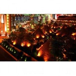 餐廳的建築風格採用看似地道的非洲風格,集結了一大八小粗略建造卻相當舒適的圓頂茅屋,同時座椅、長椅及非洲風格的壁畫隨意地放置各處。色香味俱全的非洲村,烤全羊是餐廳的主題燒烤,從非洲空運抵澳的非洲特色香料,經過廚師們的深厚功夫將它們溶入菜餚中,使美食更加散發出非洲民俗的激情豪爽。