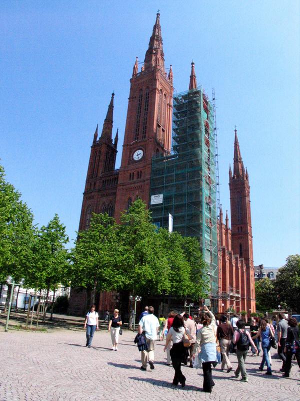 市場教堂位於舊城區,是威斯巴登地標建築之一。這座新哥特式的三殿大教堂,於 1852 至 1962 年間由卡爾•博斯(Karl Boos)設計建造,色調以紅色為主,並帶有古典主義風格,是歷史主義建築風格的典範。