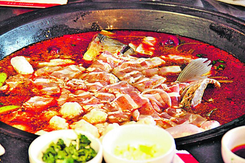首先,爐灶以柴火加熱,上面擺放了巨型鐵鍋,放入湯底,加入主要材料草魚,以及其他如牛肉、羊肉、豆腐、金菇等。而食客則圍著爐灶而坐,一邊看著草魚與豬肉在鐵鍋裏浮沉,一邊感受暖和的氣氛。