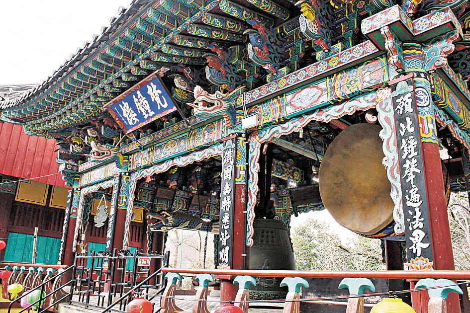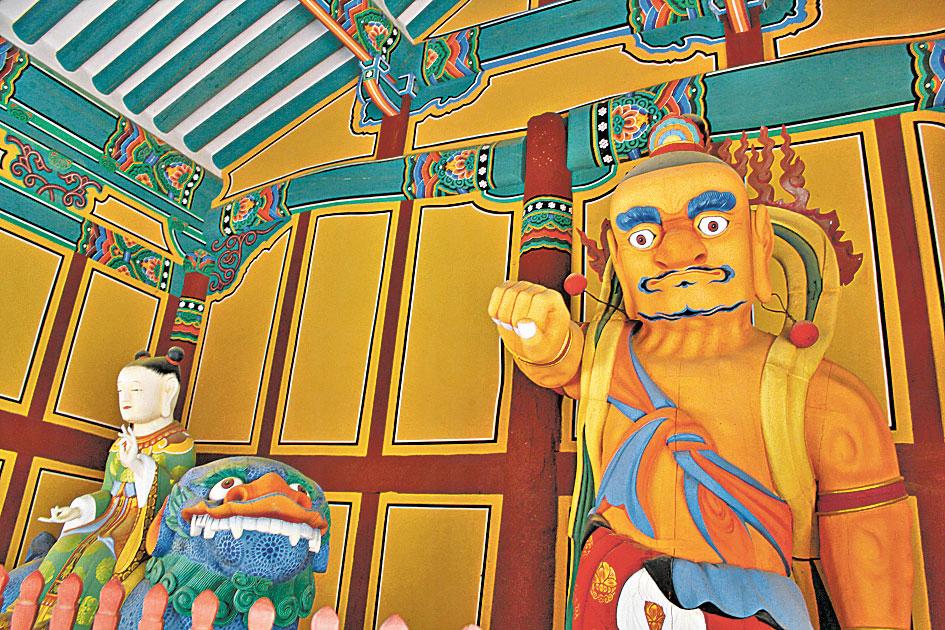 往內進去,大門同樣有四大金剛守護,樣貌卻是 Q 版的,少了威勢。一眾佛殿依山而建,全木搭建,且充滿色彩,似是近年翻新過。為國寶 500 號的大雄殿,殿前有一塊「真鑒禪師大空塔碑」,碑文精巧幼細,據說出自文人崔致遠之手,他為韓國四大金石文家之首。寶塔處處,最有名的一座藏於金堂,相傳寶塔內放有六祖慧祖的頭,善信凡圍繞寶塔走 3 圈,伸手到塔中小洞摸到類似光頭之感,代表你與佛有緣。