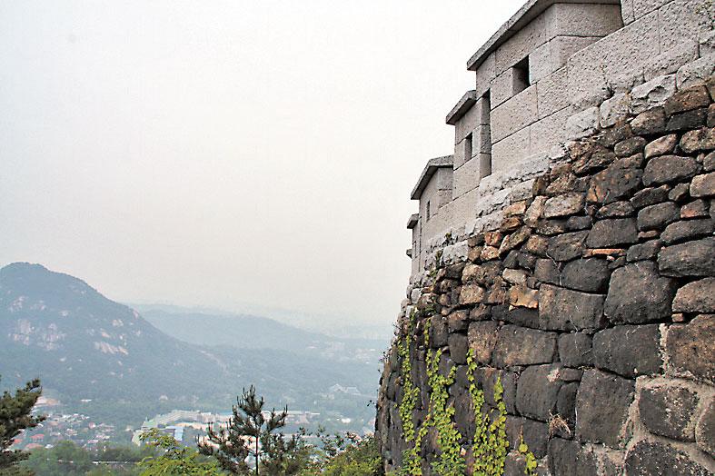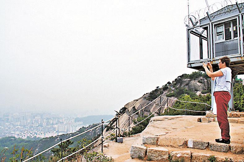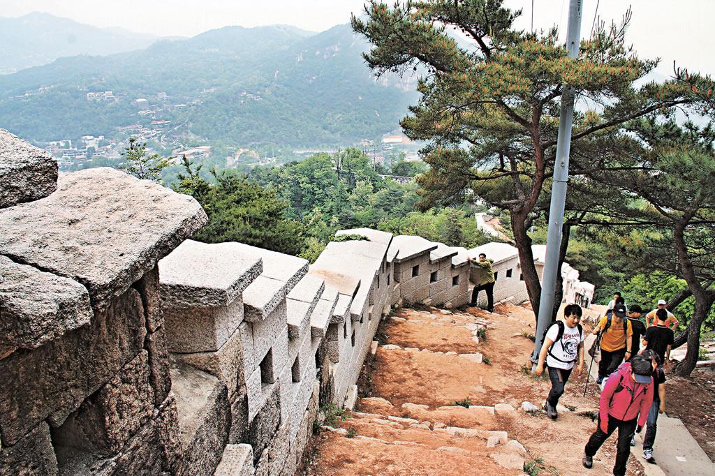 仁王山的城牆曾抵禦過日軍的侵略,又淹沒在北韓的炮火中,城牆攀越仁王山最陡峭的坡段,梯級有如山岩,難以攀登。幸好旁邊有附設的登山徑,遊人才輕容易登上頂峰。登上山頂,軍方瞭望塔能極目四顧,向東俯瞰鍾路區、景福宮、青瓦台,更可見漢江,西面是麻浦區,林立的高樓可能與山色不太協調,但這種風情真的有點像香港與市區毗連的郊野。
