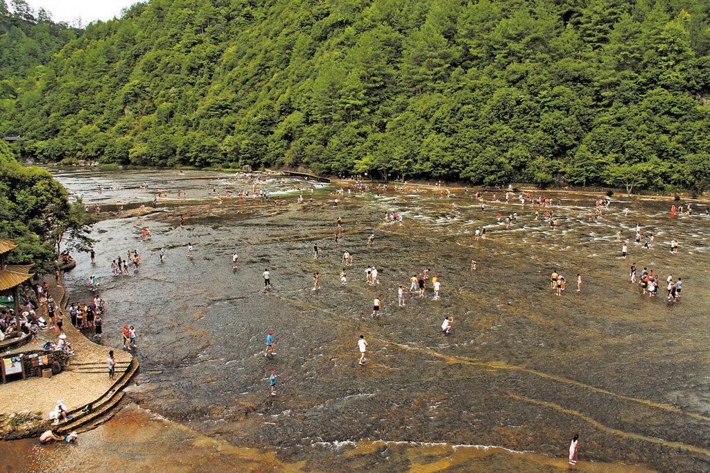 白水洋是鴛鴦溪上游的一部分,源自福建省南平市近海拔 2,000 米的高山。這裏類似 U 形冰川峽谷的地貌,使此地成為世界地質公園。據說白水洋是世上唯一的天然淺水廣場,是一處寬敞又平坦的青石河床,此河床長約兩公里,為獨一岩層構成,總面積達 8 萬平方米,最寬處 182 米。