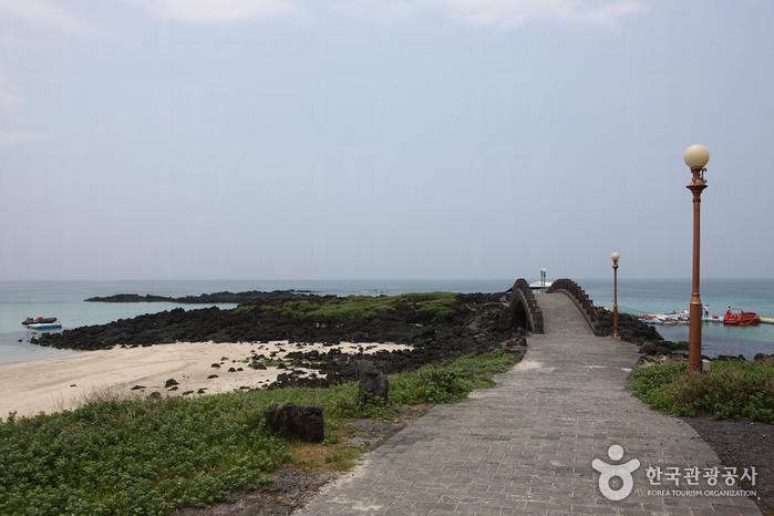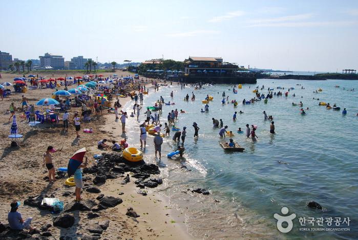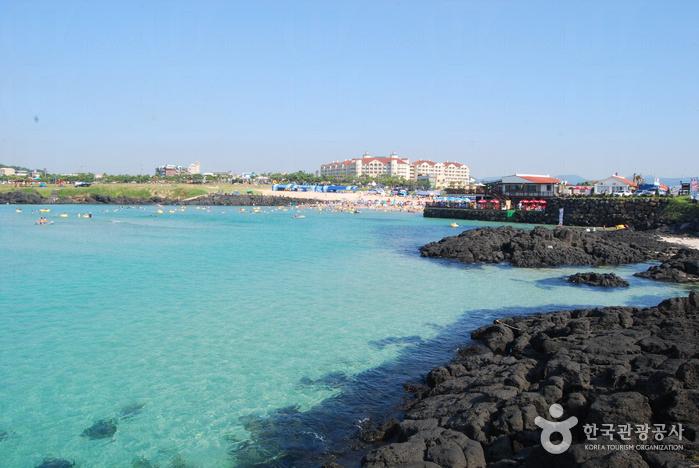 位在濟州市東方14km的咸德海水浴場,水質清澈,而且水淺,吸引許多家庭專程來此避暑度假。海水原本屬於深水海域,經過不斷沉積後形成了優質白沙,在陽光照耀下,更加閃亮奪目。這裡還有黑色玄武岩上的拱門型陸橋及紅色無人燈塔。