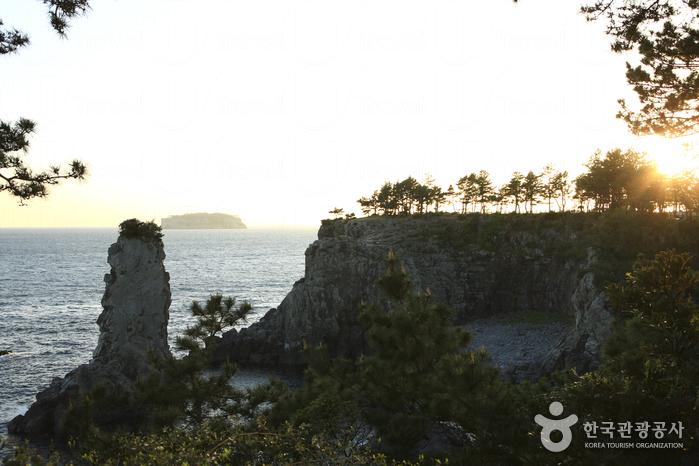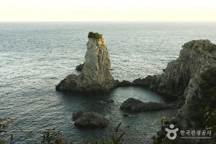 獨立岩屬於火山熔岩,高20米、寬10米,相傳出海的老爺爺遇難沒能回來,老奶奶傷心欲絕,痛苦化成岩石,因此本地人亦叫這岩石做「奶奶石」。夏天有油菜花田、秋天則有蘆葦,岸邊為韓劇《大長今》的拍攝場地。