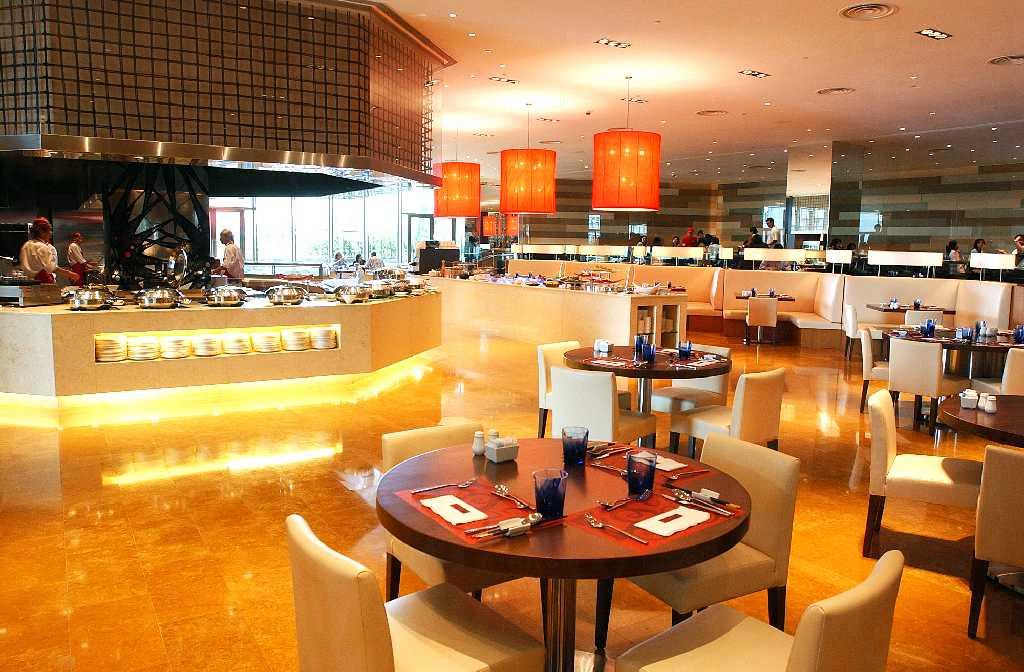 寬闊的開放式廚房與自助餐吧連成一起,而店內部分座位設於高台之上,讓人客無論處於什麼角落都能望見廚房,將廚師和人客的距離大為拉近。自助餐食物選擇豐富,水準不俗,集多國美食於一身,如意粉、東南亞美食、甜品、燒烤物、日食、新鮮海產等每日輪流上場,最特別是餐廳另設明爐燒味部和近二十款選擇的頭盤。餐廳更設自選菜譜,菜式獨特,如東薈城漢堡、英式炸魚、廚師沙律等,值得一試。