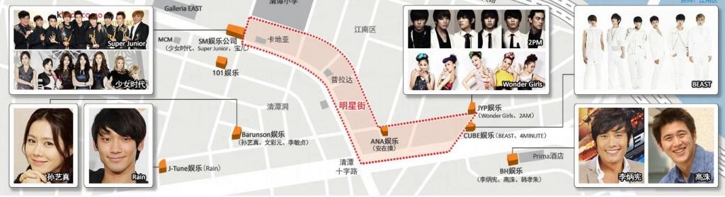 少女時代和Super Junior的經理人公司 SM 娛樂、Wonder Girls 和 2PM 的經理人公司JYP 娛樂、李炳憲的經理人公司BH娛樂等等均駐進了首爾名星街。
