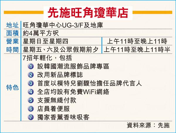 百年老店入潮區,為洗脫「老餅」形象,先施推7招令品牌年輕化,包括設韓國潮流服飾專區,引入Blue Rabbit、Sixieme、Zoo Zoom等韓國品牌,佔時裝1至2成,「韓劇及K-pop都很流行,韓國服裝受年輕人歡迎,品牌有國際視野,剪裁合亞洲人。」馬景煊指韓流與現有的意大利、德國時裝相輔相成,擴闊客群;場內亦新設Gel甲專櫃。